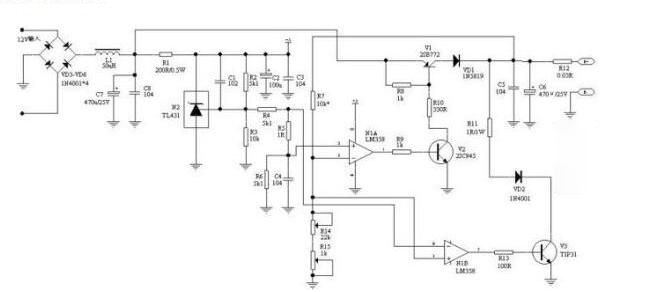 220V市電經變壓器降壓后,得到12V左右的不穩定交流電壓,該電壓經VD3-VD6整流,經L1、C7濾波后,得到不穩定的12V直流電,N2、R1-R6、C2構成穩壓電路,其輸出為穩定的5V電源,該電源提供給LM358運算放大器,作為LM358的電源使用。N2的第一腳為恒定的2.5V,作為基準電壓經分壓后提供給LM358作比較用。