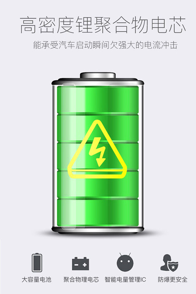 采用更強勁的高倍率鋰聚合物電芯,同樣容量可啟動汽車次數更多;高倍率鋰聚合物電芯可承受汽車啟動瞬間帶來的強大電流,并且內置智能電池管理IC,使用更安全。