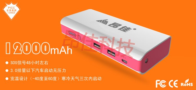 • 主要的功能:汽車應急啟動、LED燈(照明、爆閃、SOS)、另可對車載電器、手機、平板電腦、MP3、MP4、數碼相機、PDA、掌上游戲、學習機等產品充電。