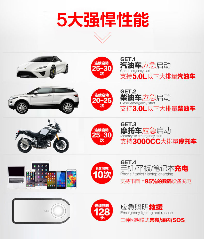 - 主要的功能:汽車應(yīng)急啟動、LED燈(照明、爆閃、SOS)另可對車載電器、手機、平板電腦、MP4、數(shù)碼相機、PDA、掌上游戲機、學(xué)習(xí)機等產(chǎn)品充電